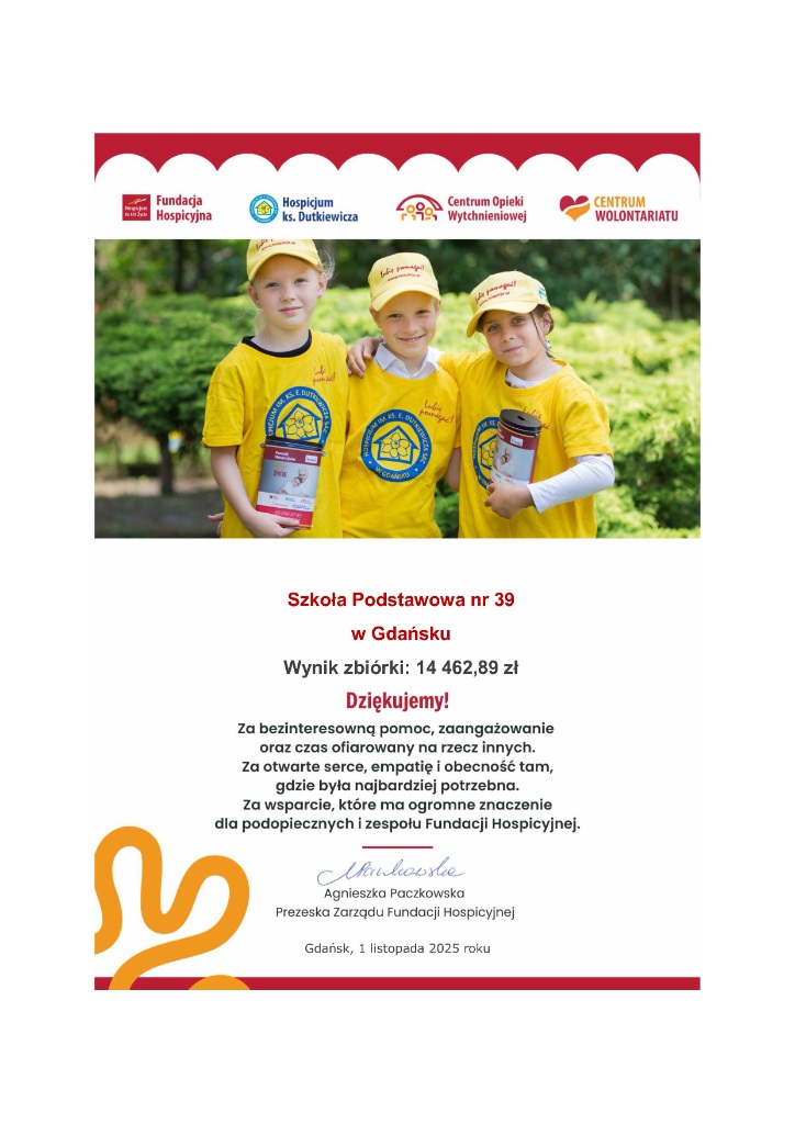 Wolontariusze ze Szkoły Podstawowej 39 zebrali łącznie 14 462,89 zł. DZIĘKUJEMY i GRATULUJEMY!!! Dzięki Wam nasza akcja stała się czymś więcej niż tylko zbiórką — była pięknym świadectwem troski o tych, którzy najbardziej potrzebują naszej obecności. 💛