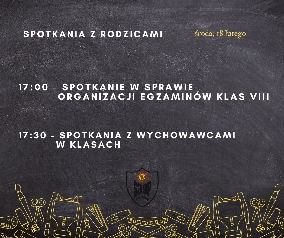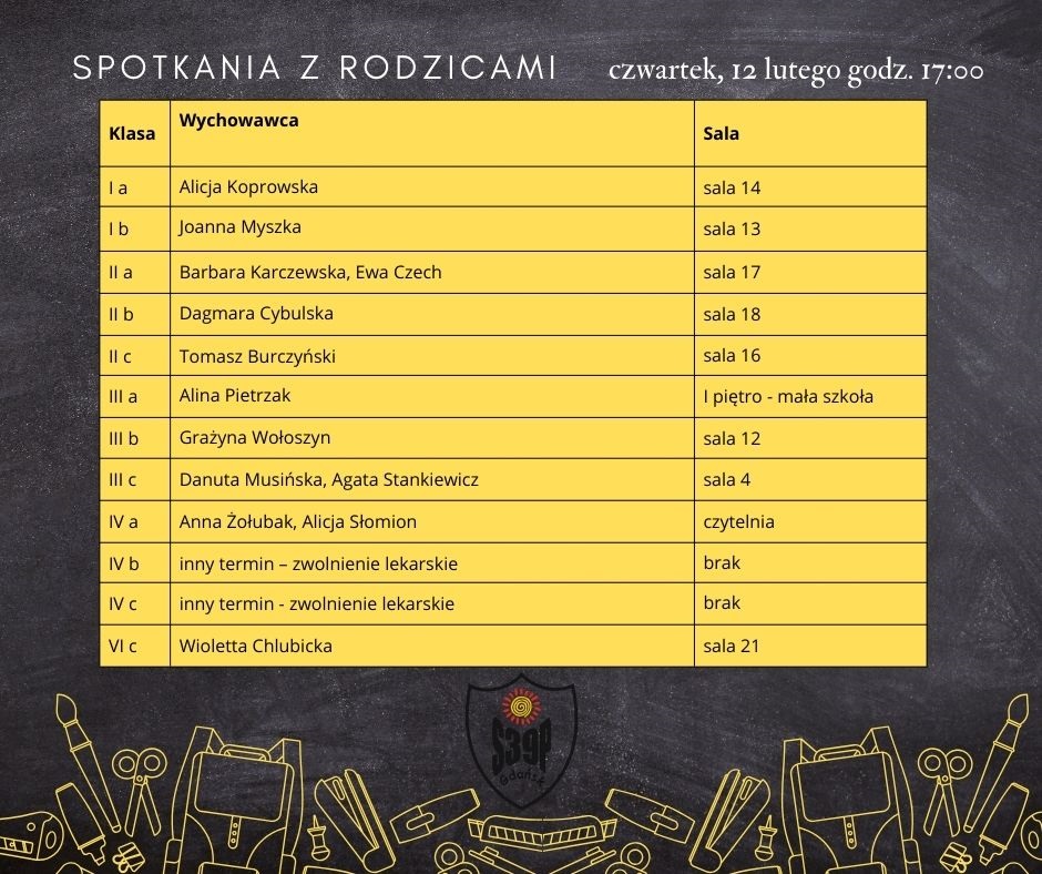 Poniżej zamiaszczamy rozkład sal na spotkania z rodzicami w dniach 11, 12 i 18 lutego 2026 r.