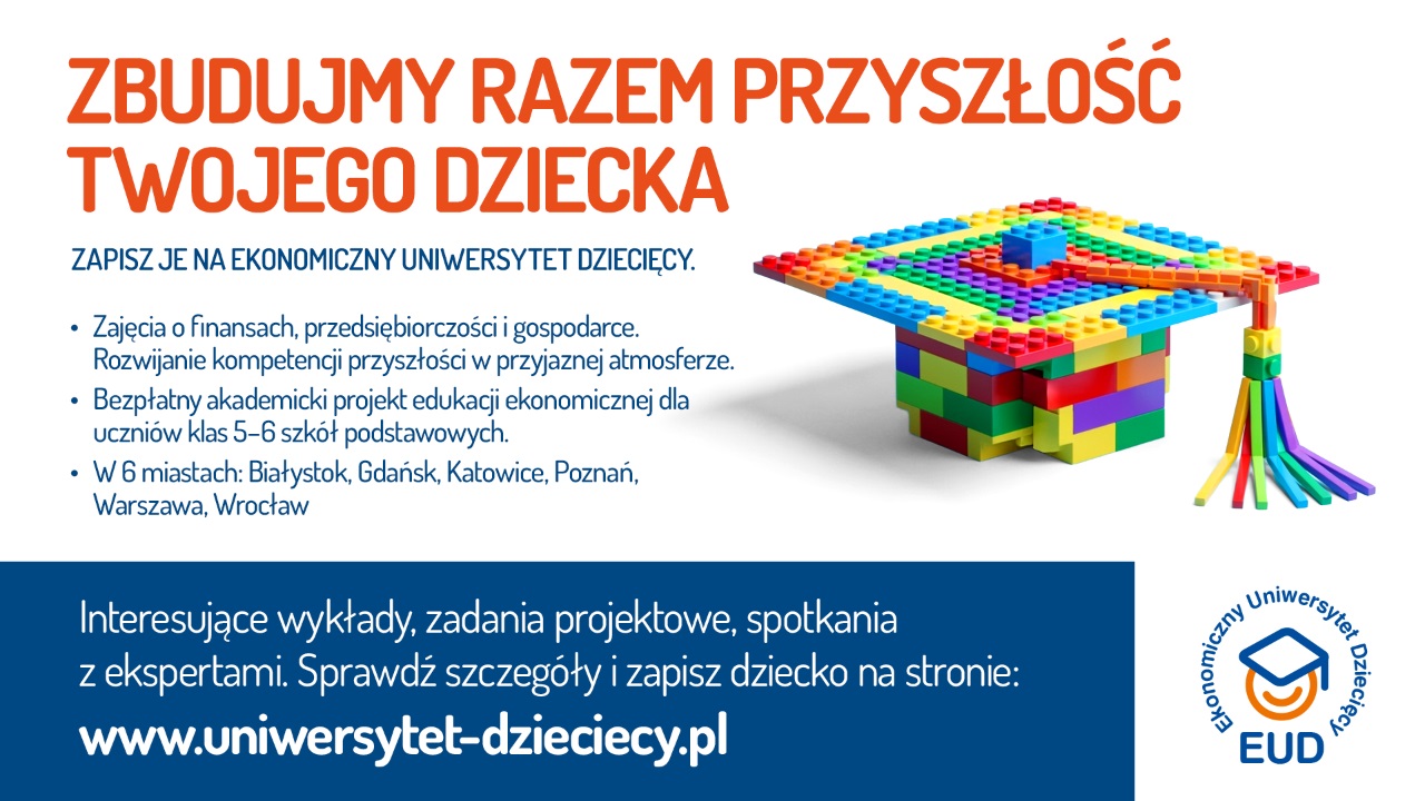 Ekonomiczny Uniwersytet Dziecięcy (EUD) to wyjątkowy bezpłatny projekt edukacyjny, który ma na celu rozwijanie u dzieci postaw przedsiębiorczych oraz propagowanie edukacji ekonomicznej. Adresowany jest do uczniów urodzonych w latach 2011-2014. W trakcie EUD, równolegle odbywają się zajęcia dla rodziców/opiekunów.